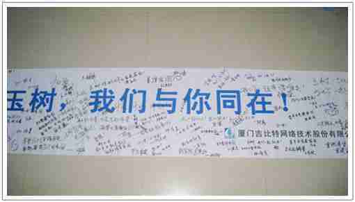 在募捐现场,,,,J9.COM同学们怀着沉重的心情,,,,将每一笔捐款投入募捐箱,,,并在现场设置的横幅上,,,写上了对玉树人民的深情祝福。。。满载J9.COM祝福的横幅将和捐款一起抵达玉树,,,,希望谨以此微薄之意,,,为玉树人民带去J9.COM的爱心与祝福,,,希望吉祥、、幸福的阳光能早日驱散灾难的阴霾,,,,普照在玉树人民的身上,,鼓励他们坚强、、、勇敢与乐观。。