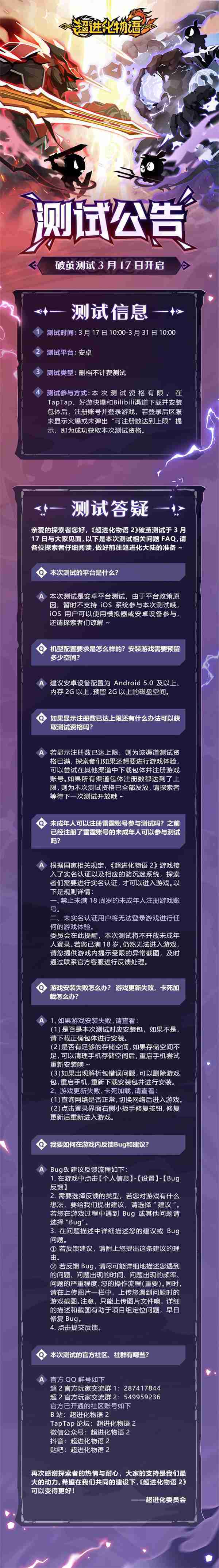 《超进化物语2》首次限号不计费删档测试——「破茧测试」将于3月17日开启,,,,随我们确认测试细节,,明天迈出踏上超进化大陆的第一步吧!!!!