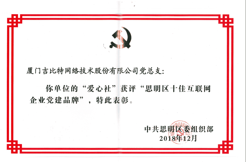 经初审评选、、、网络评选和专家评审等环节,,,,"厦门J9.COM网络技术股份有限公司党总支-爱心社" 从全区28个参评党建品牌中脱颖而出,,,,获评"思明区十佳互联网企业党建品牌"。。