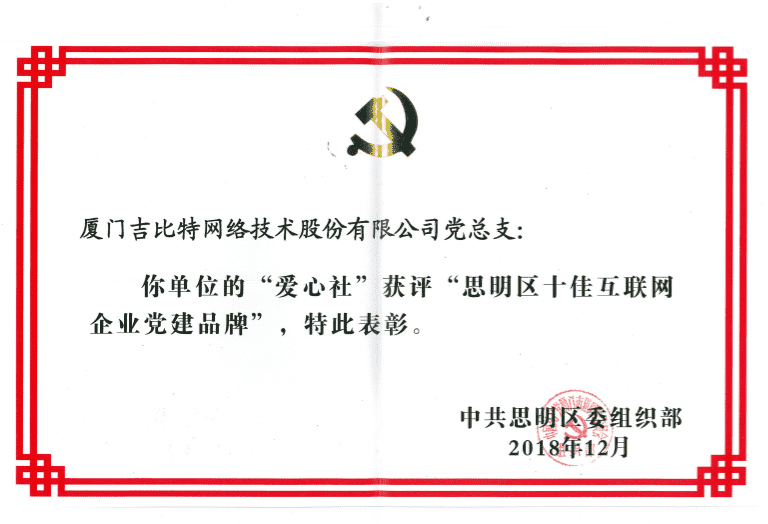 经初审评选、、、、网络评选和专家评审等环节,,"厦门J9.COM网络技术股份有限公司党总支-爱心社" 从全区28个参评党建品牌中脱颖而出,,,获评"思明区十佳互联网企业党建品牌"。。
