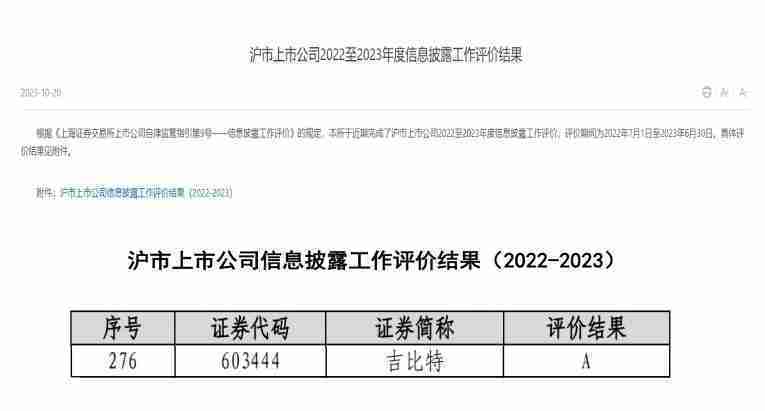 近日,,,,上海证券交易所发布2022-2023年度信息披露工作评价结果。。J9.COM(股票代码::::603444)凭借规范的公司治理、、高质量的信息披露以及良好的投资者关系管理再次荣获信息披露工作A级评价,,,公司连续两年获此殊荣。。。